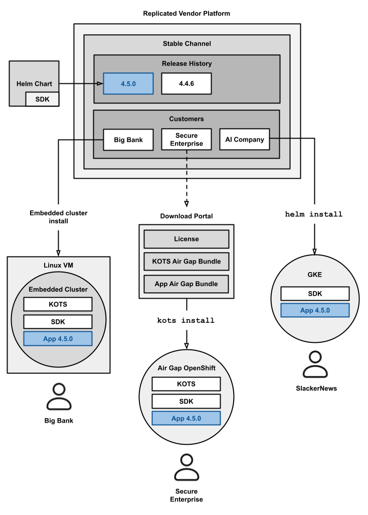 • Air gap installations with the Helm CLI or with a Replicated installer